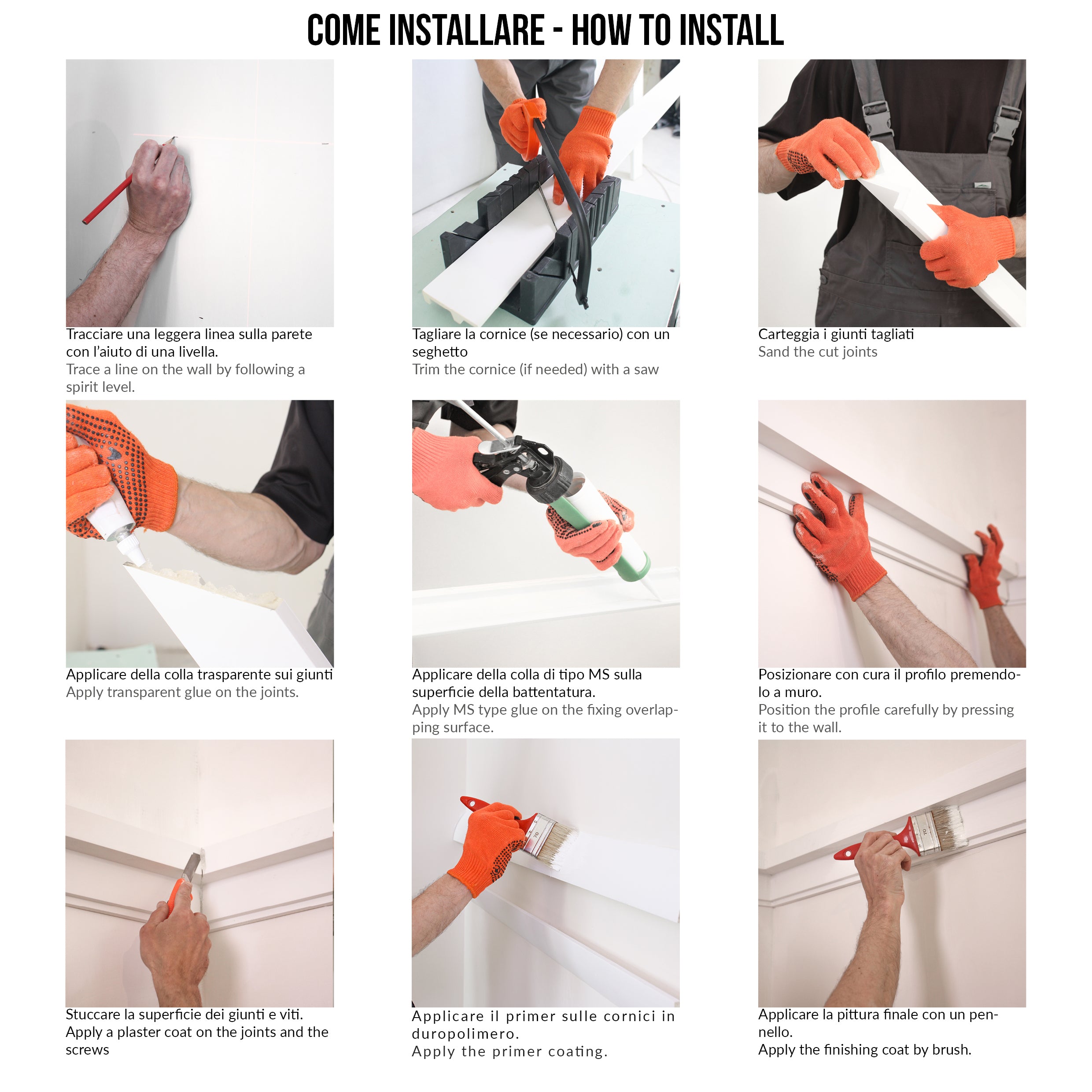 Le cornici si applicano con colla polimerica MS a presa rapida o equivalenti.